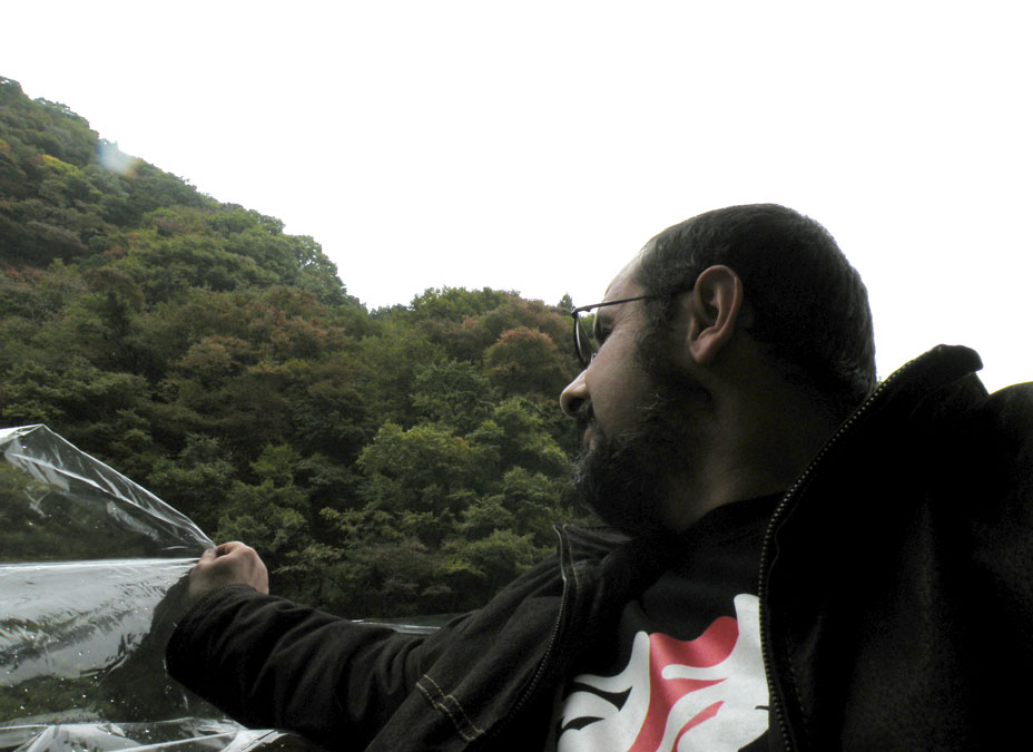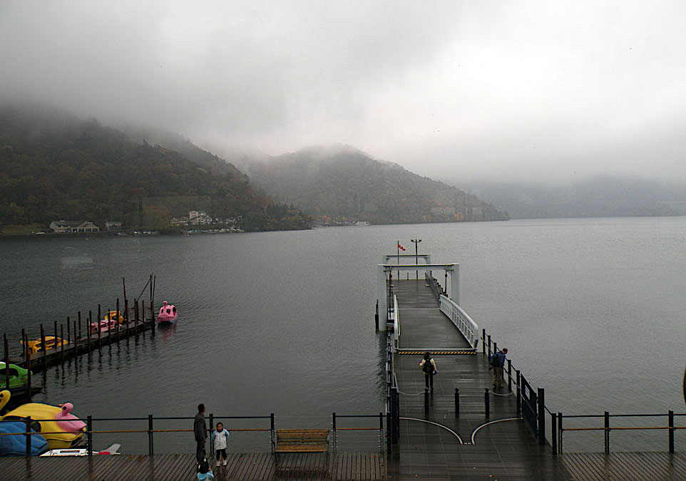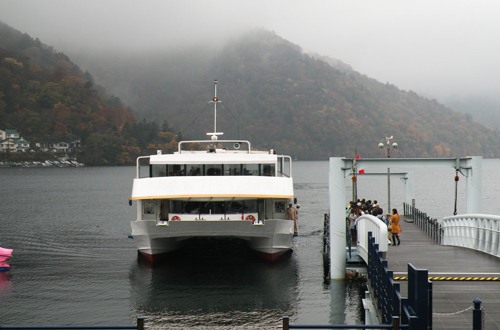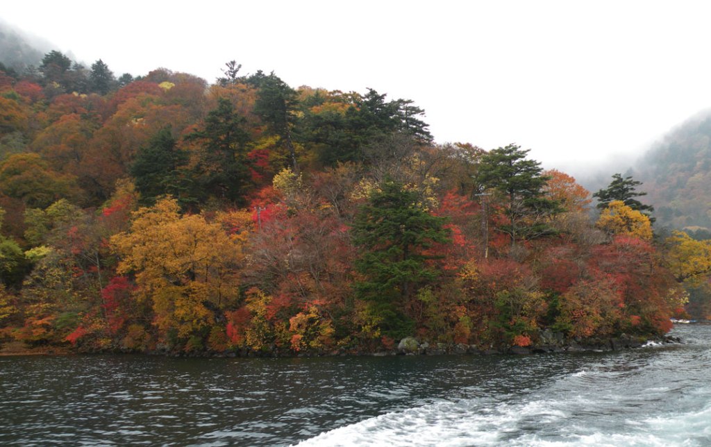 Nu avem prea mult timp de contemplare. ”Corabia” sosește, pasagerii debarcă ordonat și rapid. Este rândul nostru la îmbarcare. Cu aceeași eficiență, întâlnită mai peste tot în Japonia, disciplinați, atenți și repede, ne îmbarcăm și până să mă dumiresc am și plecat pe valuri! Petrec prima parte a călătoriei pe puntea deschisă, apoi rebegit de frig și ud de ploaie intru la adăpost. Nu pot descrie ce am văzut, simțit, trăit. Ar fi nevoie de o carte, nu merge într-un articol de blog. Minunatul peisaj de toamnă, munții din preajma lacului, căsuțele și ”vilele” ascunse prin pădure, toate parcă erau desprinse din povești.