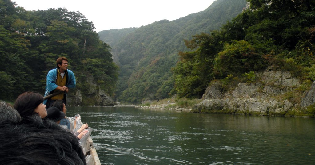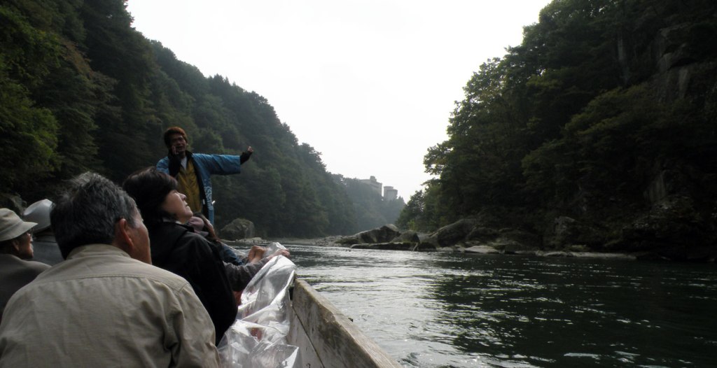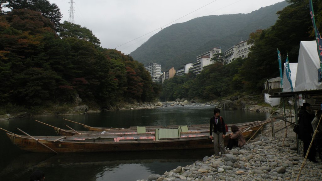 Pe maluri, printre stânci și copacii îmbrăcați în haine de toamnă, se văd clădiri mari ce arată a hoteluri sau pensiuni, toate cocoțate la mare înălțime. Din loc în loc vâslașii opresc bărcile și explică ceva indicând repere de pe mal. Watanabe san m-a întrebat odată dacă vreau să-mi traducă, am mulțumit negând. Îmi ajungea admirarea frumuseților din jur.